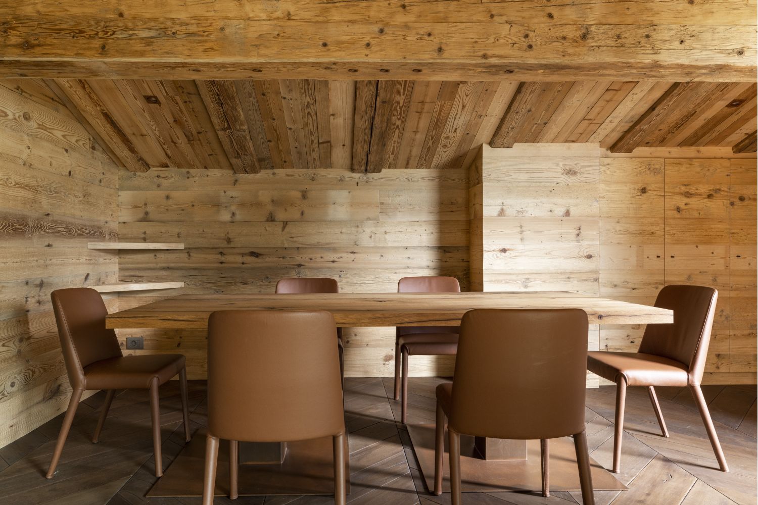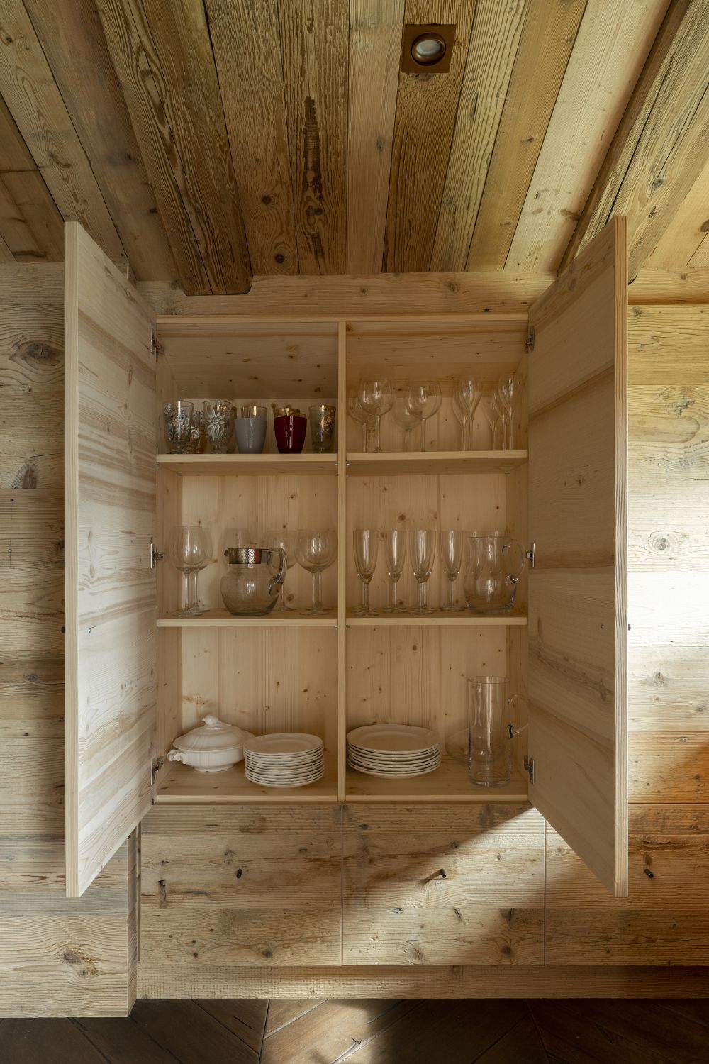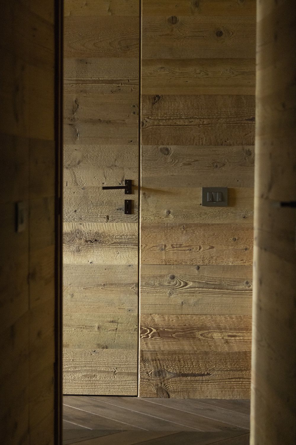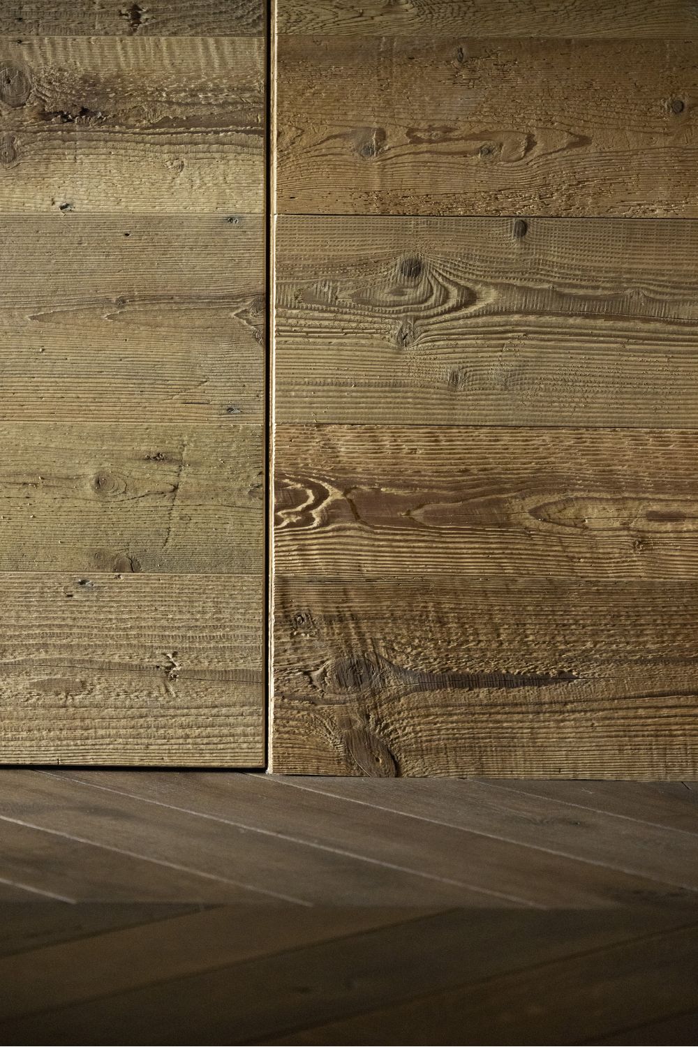 I pavimenti sono in rovere antico, posati a spina pesce francese con larghezze irregolari. Soffitti e boiserie sono in abete antico prima patina: recuperato, restaurato e riutilizzato. I mobili sono stati realizzati con lo stesso legno d’abete, lavorati massicci.