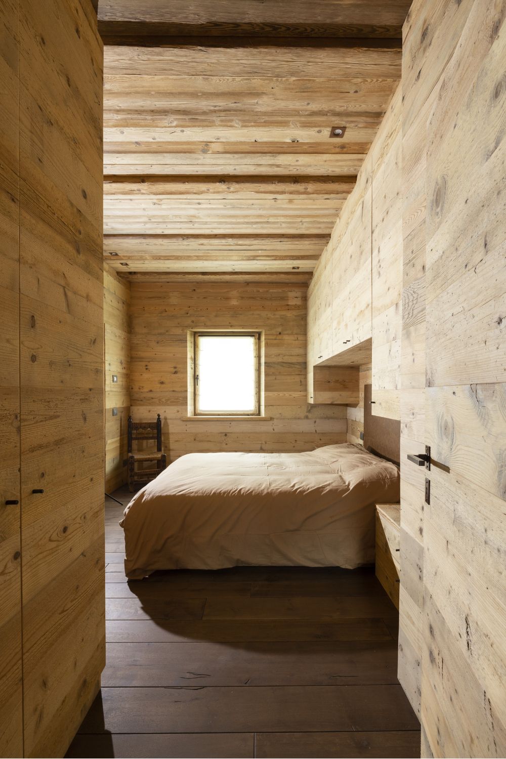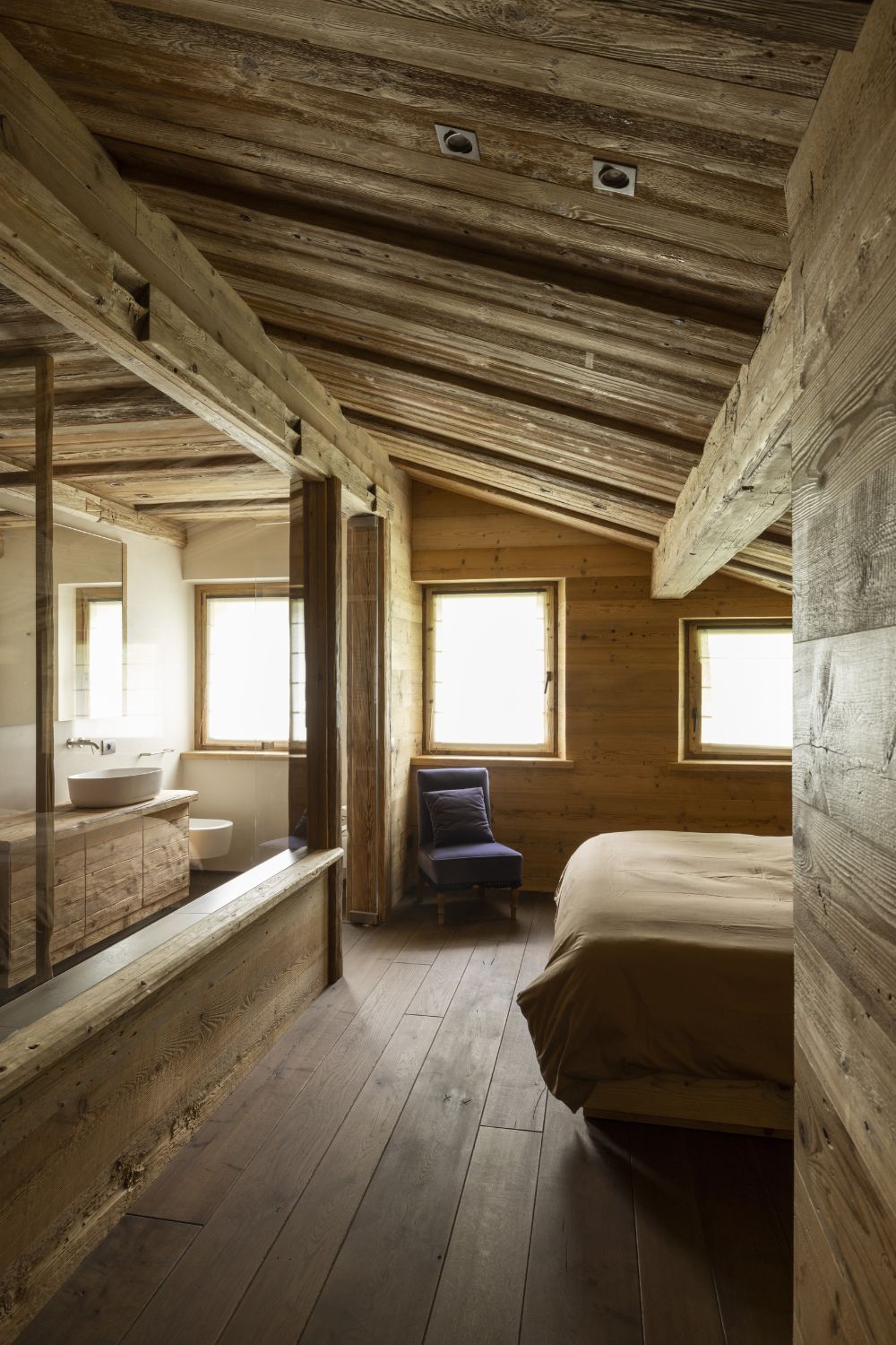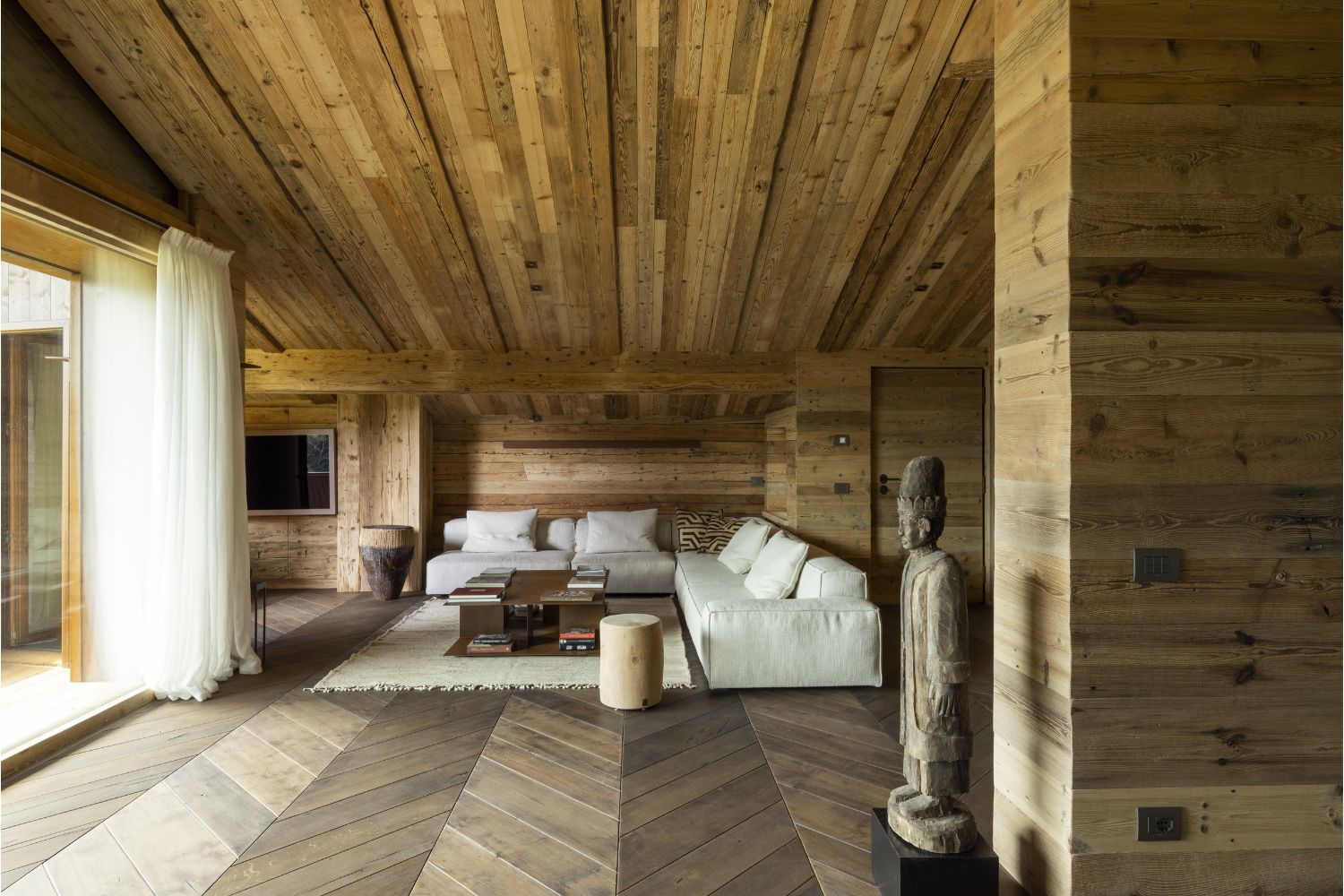 I pavimenti sono in rovere antico, posati a spina pesce francese con larghezze irregolari. Soffitti e boiserie sono in abete antico prima patina: recuperato, restaurato e riutilizzato. I mobili sono stati realizzati con lo stesso legno d’abete, lavorati massicci.