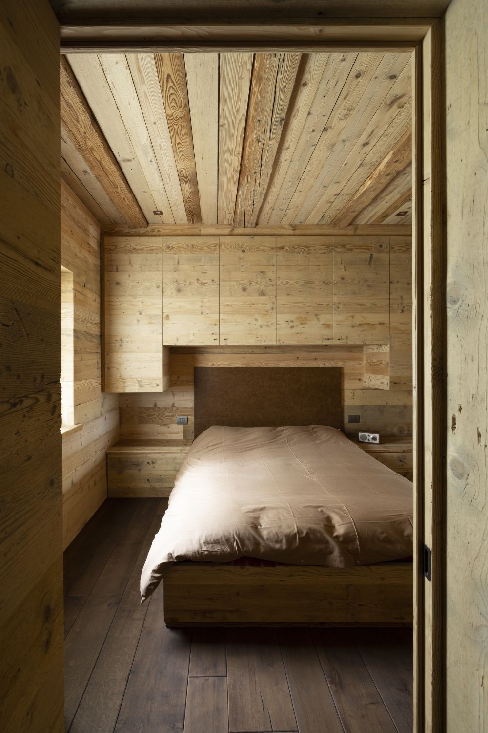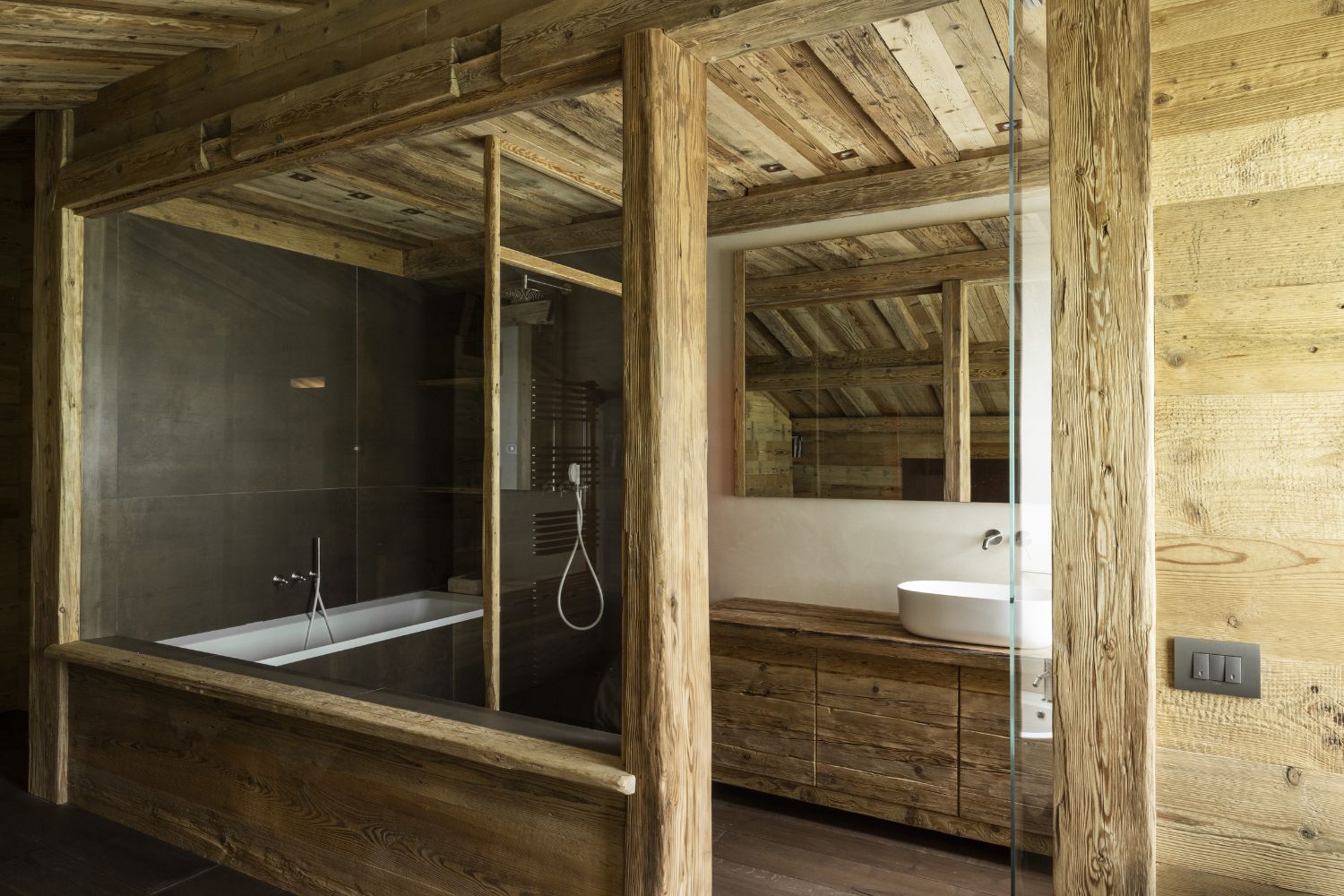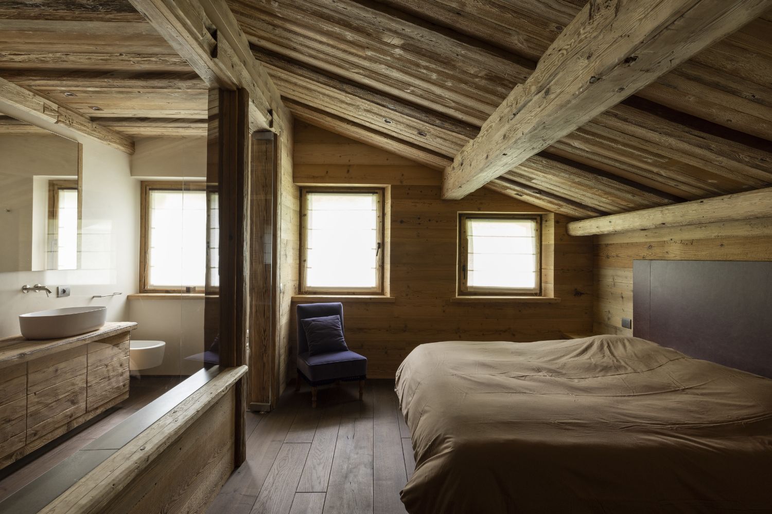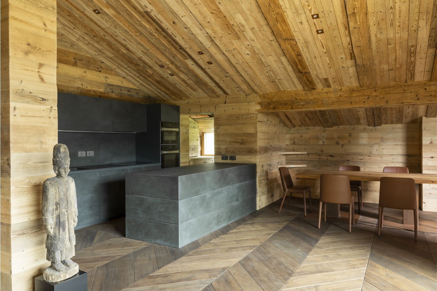 I pavimenti sono in rovere antico, posati a spina pesce francese con larghezze irregolari. Soffitti e boiserie sono in abete antico prima patina: recuperato, restaurato e riutilizzato. I mobili sono stati realizzati con lo stesso legno d’abete, lavorati massicci.