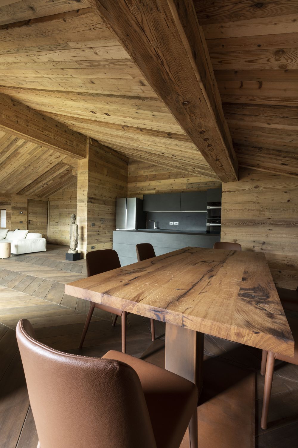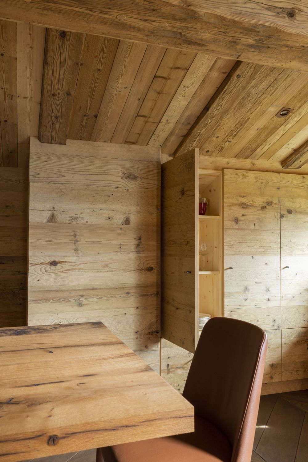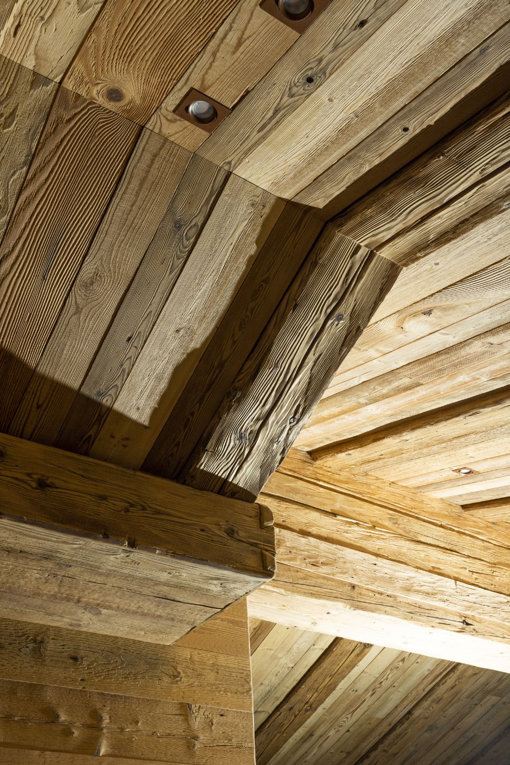 Il controsoffitto in tavole di abete antico, insieme alle travi, dona un aspetto rustico e vissuto. Si possono notare i sistemi di illuminazione integrati.