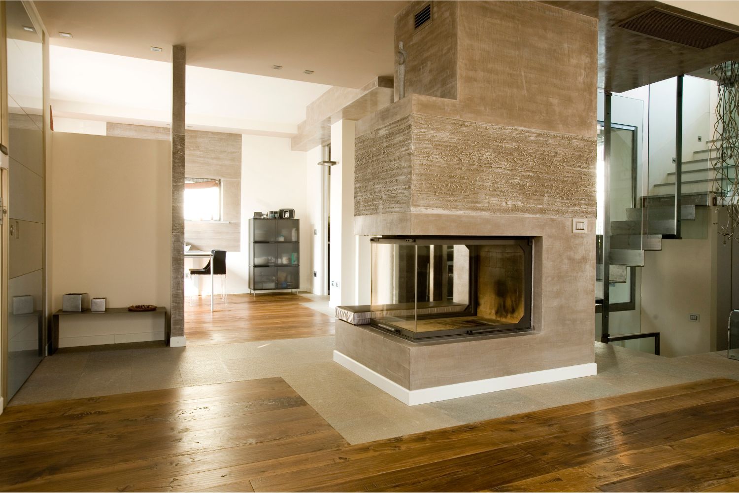 Si può anche apprezzare la bella combinazione del legno antico con la pietra delle scale e del caminetto.