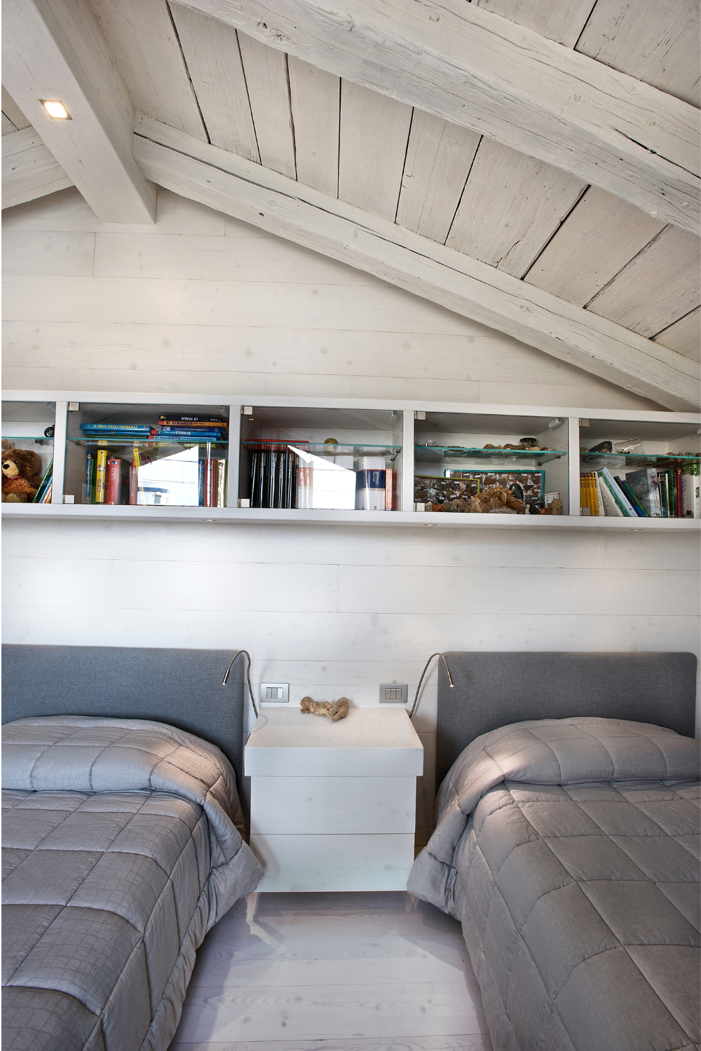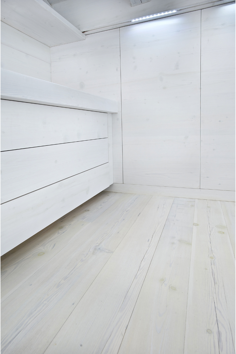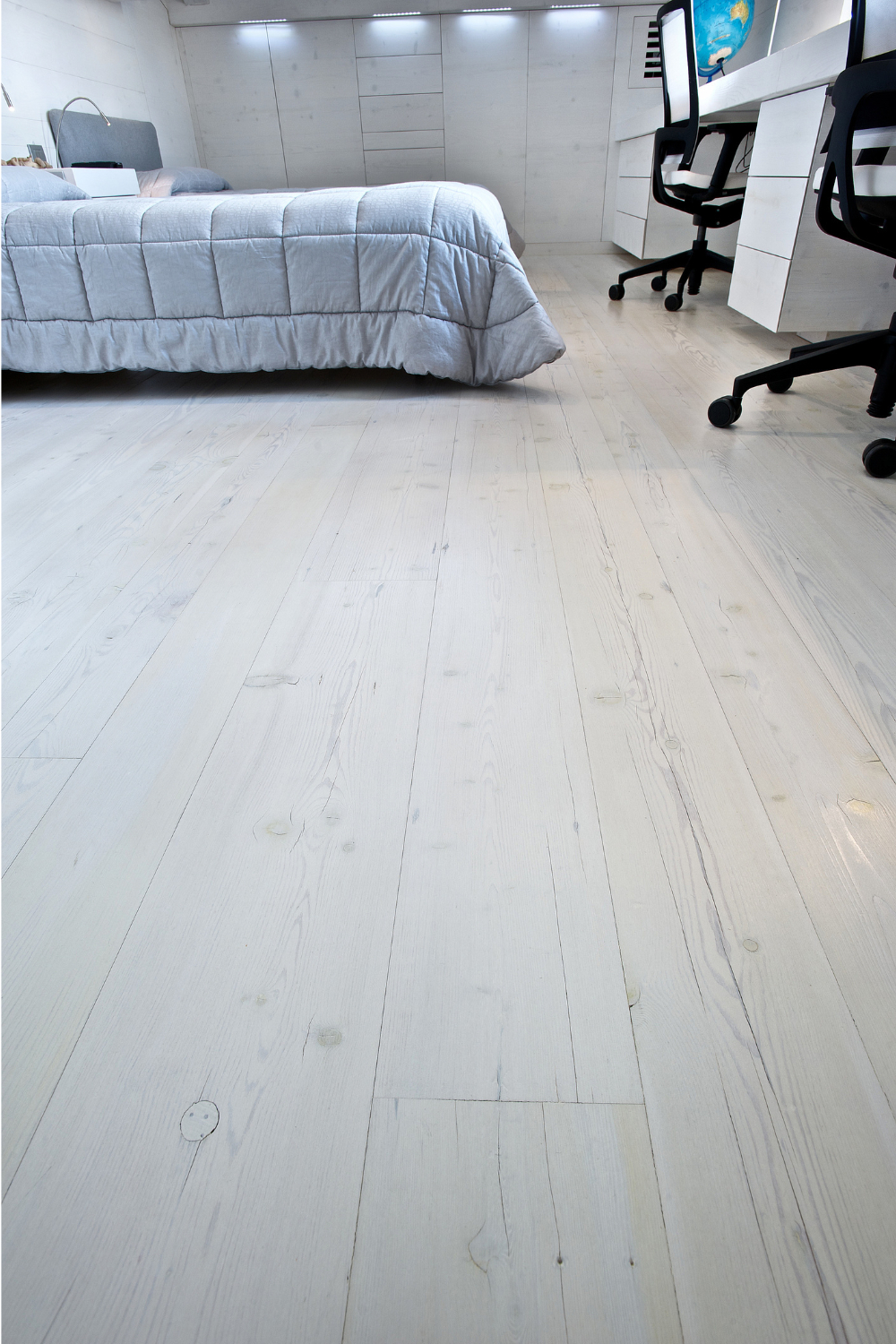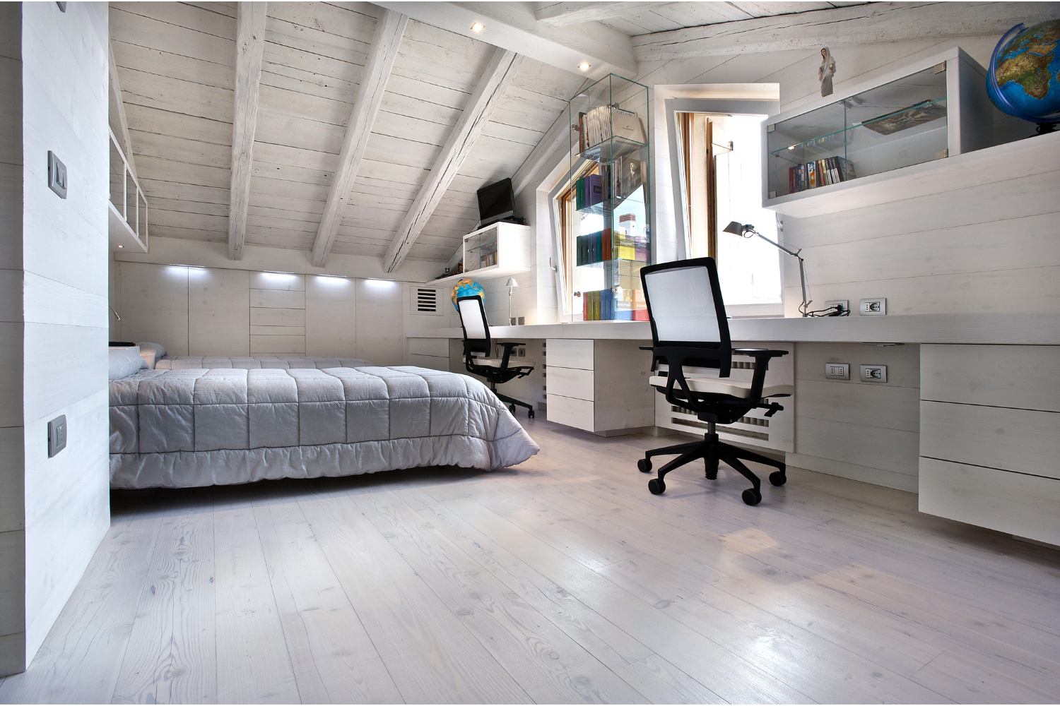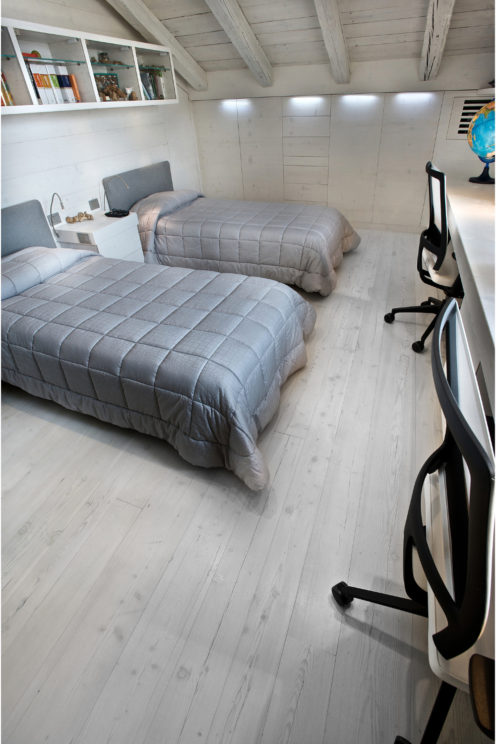 Camera da letto mansardata, con travi e tavole di controsoffitto in larice antico di prima patina cerato bianco. Rivestimento di pareti e pavimento in larice antico di seconda patina cerato sbiancato.