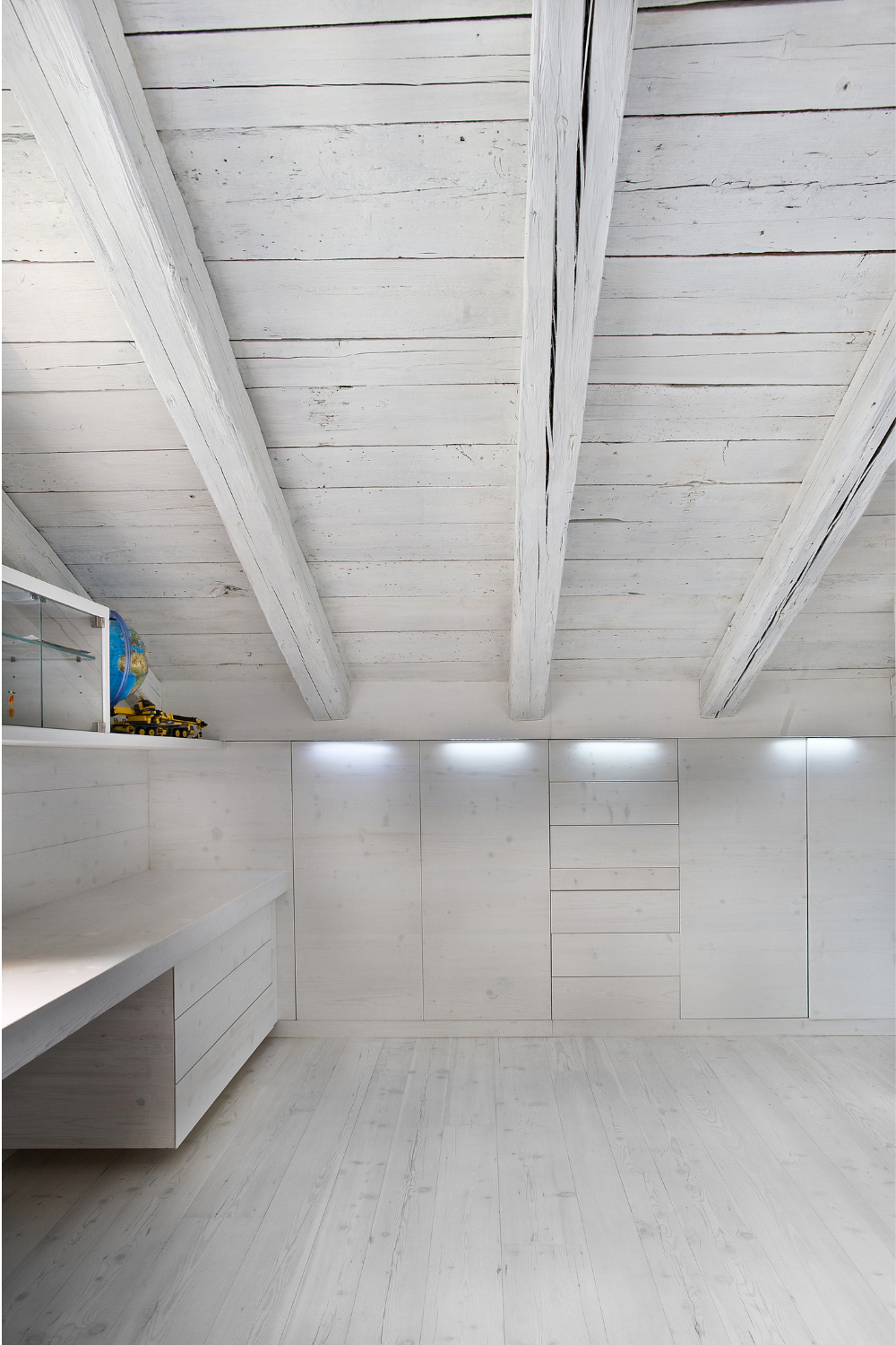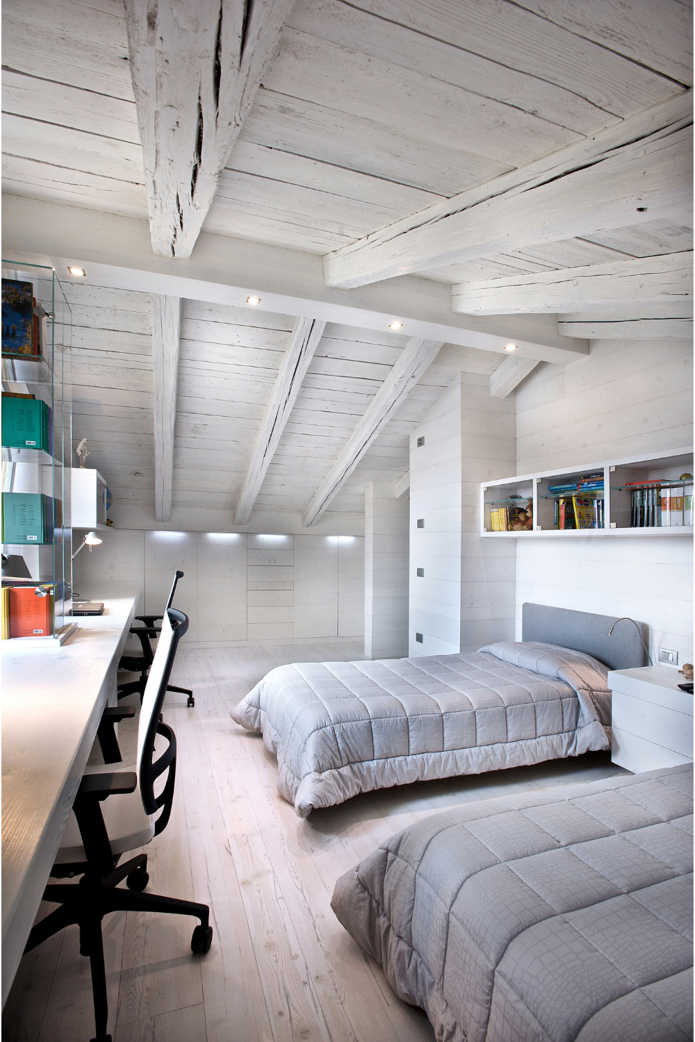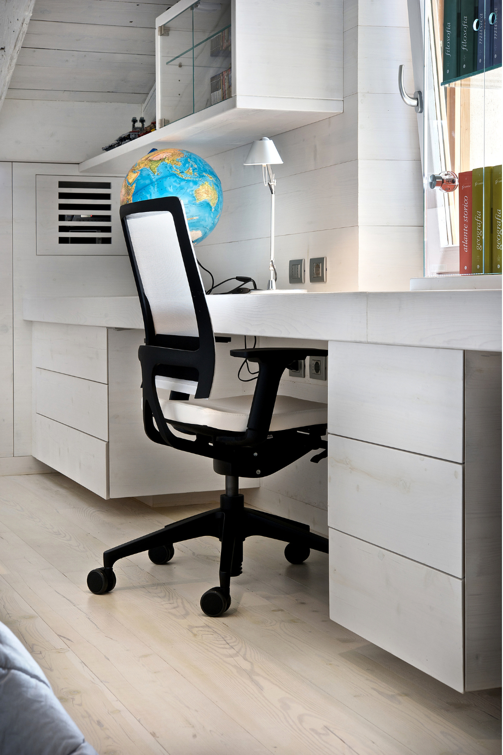 Nelle pareti sono integrati copritermosifoni , armadiature ,tavolo da lavoro e cassettiere realizzati con larice antico cerato sbiancato. Progetto realizzato su misura a Belluno.
