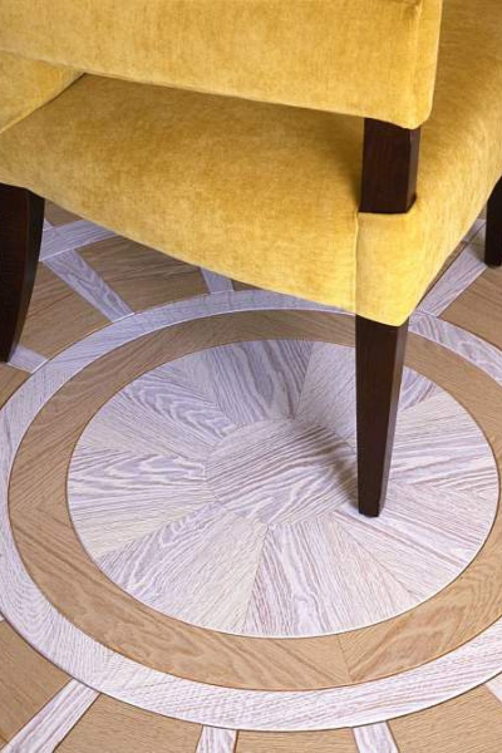Abbiamo realizzato anche un bellissimo rosone di grandi dimensioni che delimita il centro del salone. Il disegno creato per il cliente alterna elementi in rovere naturale e rovere sbiancato.