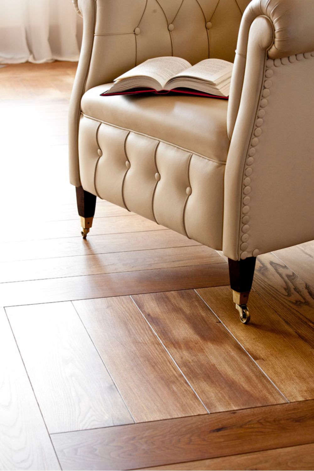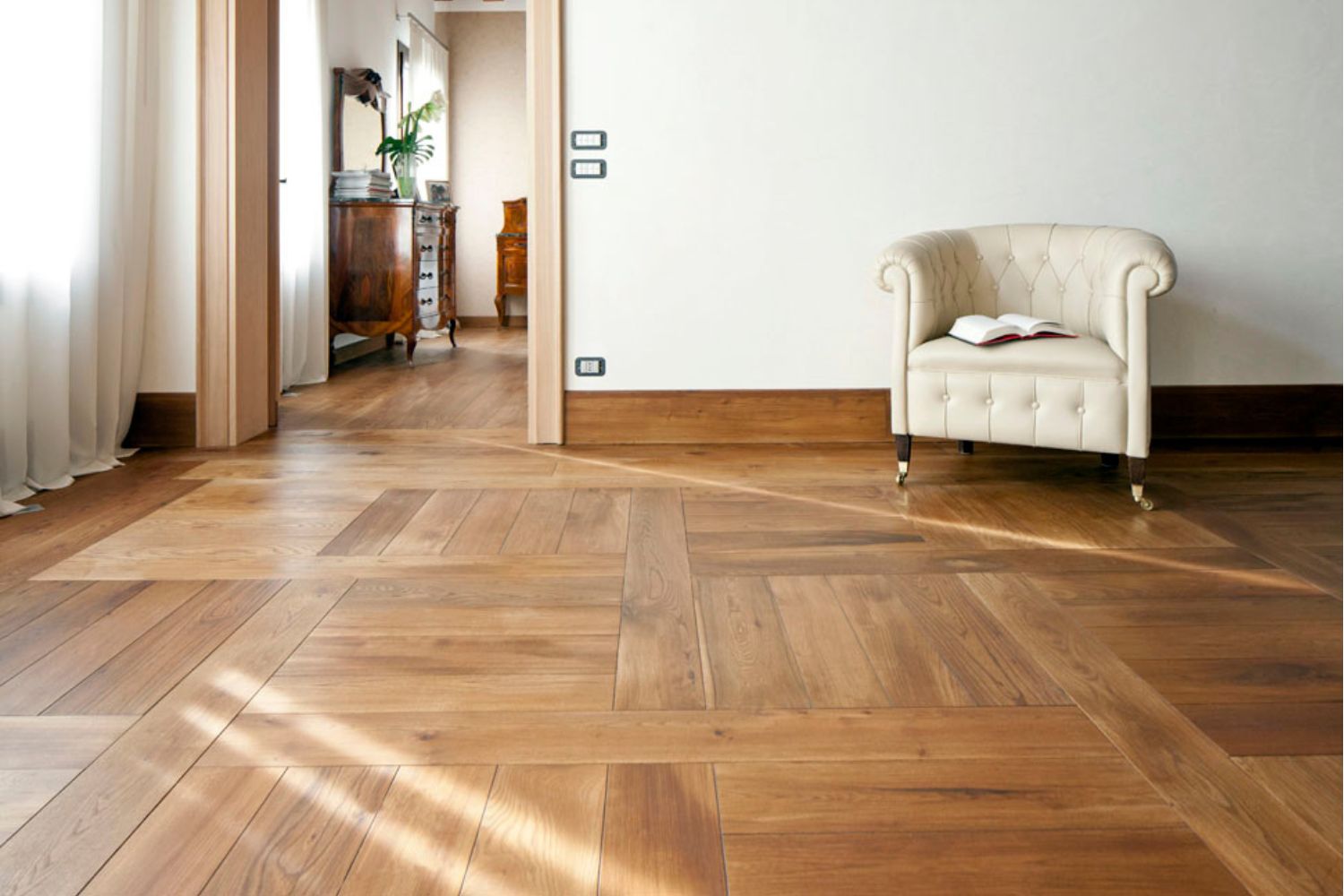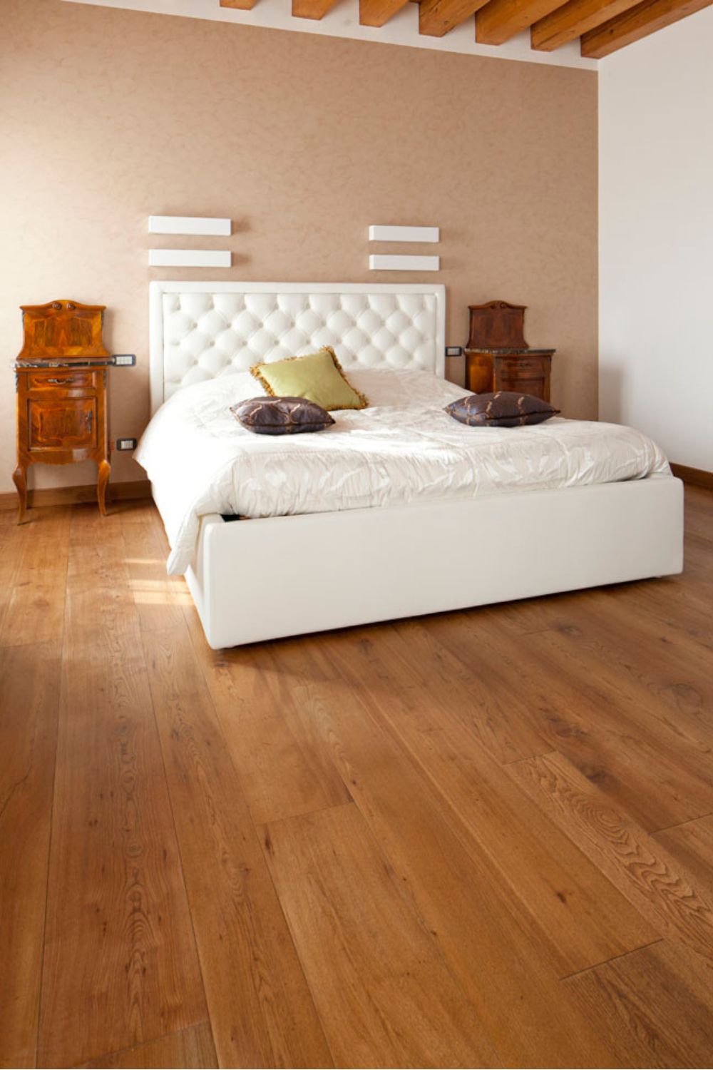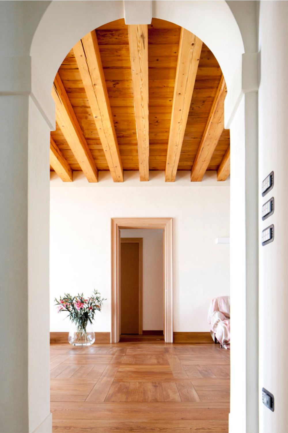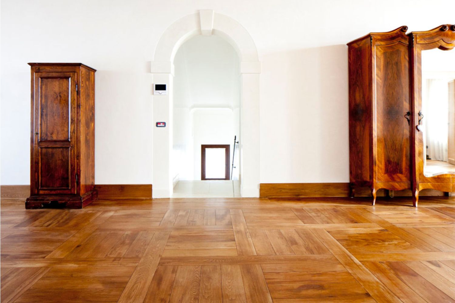 Per questo lavoro di restauro di una villa veneta, il cliente ha scelto tavole di olmo vecchio tonalizzato con una cera honey. La colorazione finale si sposa perfettamente con mobili e porte.