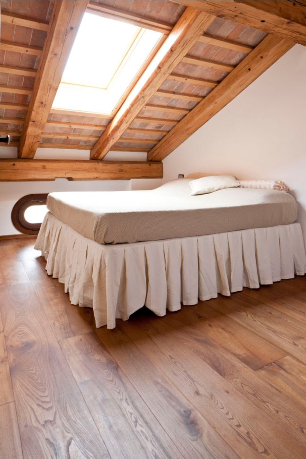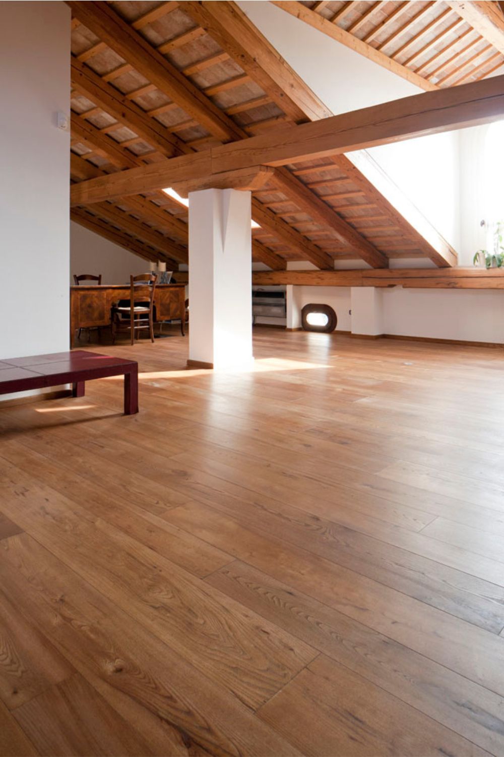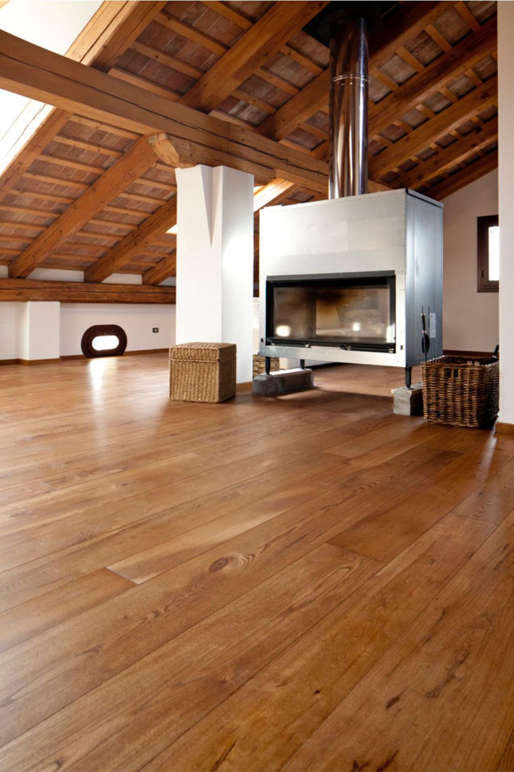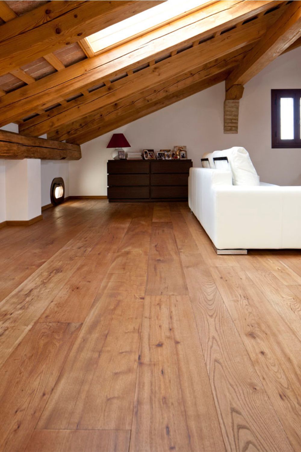 Per la zona notte e la zona mansarda è stata scelta una posa a tolda di nave, a correre, con battiscopa bassi.